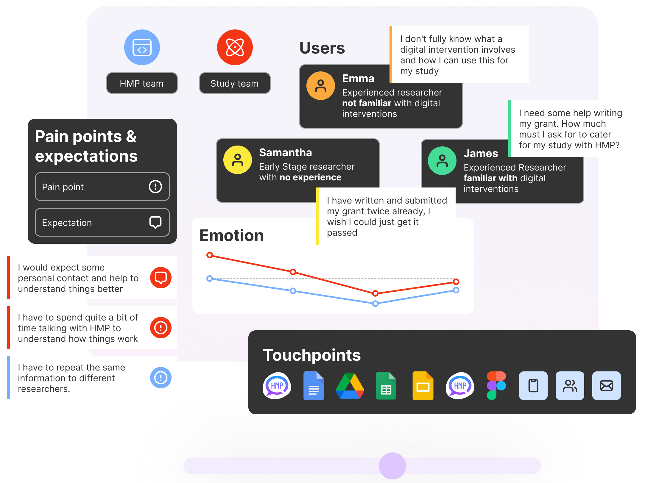 We kicked off with multiple discovery workshops with stakeholders, mapping the workflows and emotional journey across both the Research and HMP teams. We overlaid pain points and expectations at each step, as well as the touch points and tools being utilised. After our personas were complete, we then pushed further into insight, mapping what each persona is thinking, doing, saying, and feeling at each step. That clarity exposed key experience gaps and helped align everyone around a clear vision for the product.